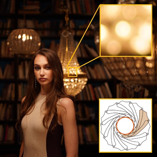 While the two XA elements effectively suppress onion ring bokeh, the 11-blade circular aperture maximizes the beauty of this large-aperture prime-lens, contributing to impressive images in which the subject stands out against a smoothly defocused foreground and background, as well as perfectly round points of defocused light. Conventional aperture blades have flat sides that create unappealing, polygonal-shaped defocused points of light. This lens overcome this problem through a unique design that keeps the aperture almost perfectly circular from its wide-open setting to when it is closed by 2 stops. Smoother, more natural defocusing can be obtained as a result.