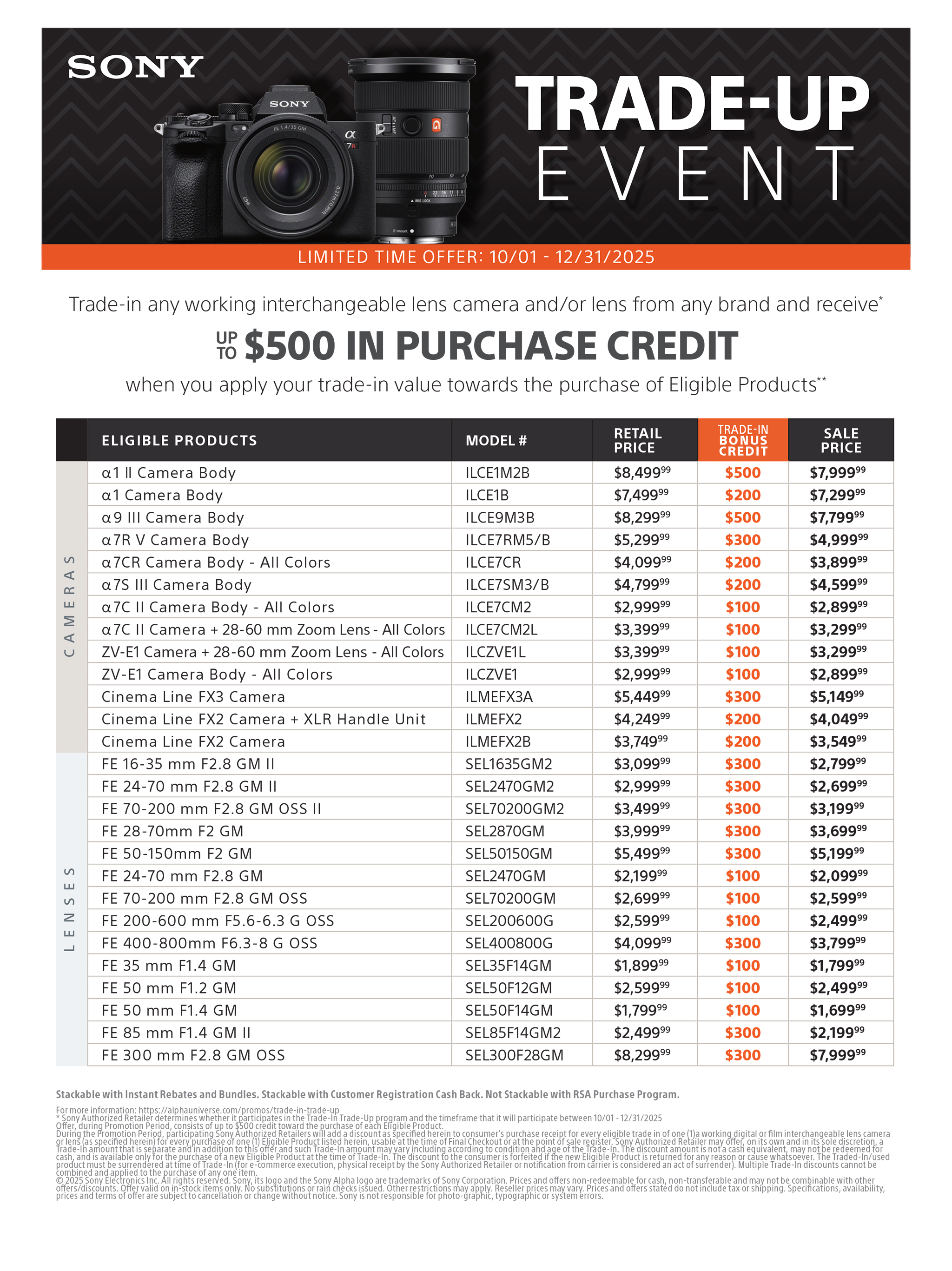 Trade-in one working digital interchangeable lens camera or lens and receive up to a $500 trade-in bonus credit towards the purchase of select Sony Full-Frame mirrorless cameras and lenses.